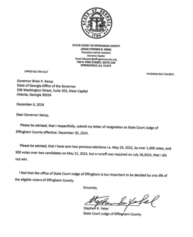 In a response letter, Kemp denied Yekel’s resignation request “out of respect for the will of the people of Effingham County.” Yekel stated in his request, “I feel that the office of State Court Judge of Effingham is too important to be decided by only 6% of the eligible voters of Effingham County.”