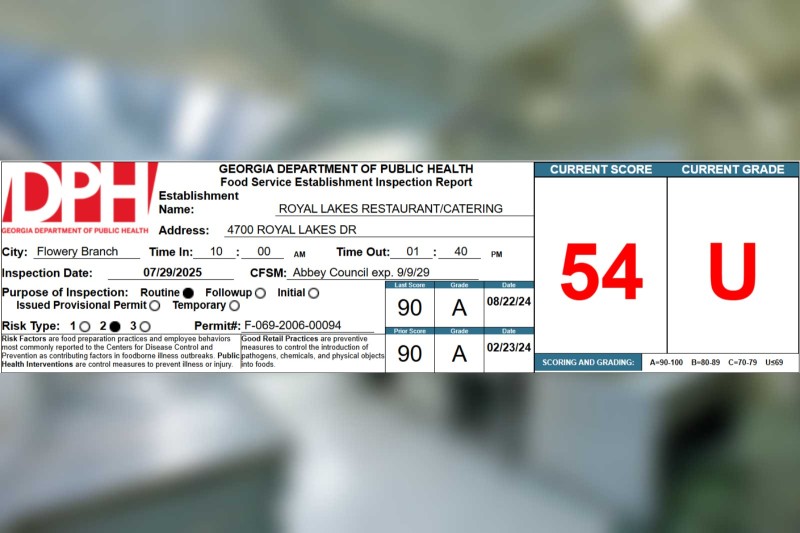 Royal Lakes Restaurant/Catering in Flowery Branch receives a 54% on their recent health inspection Hall County News·Health Inspections