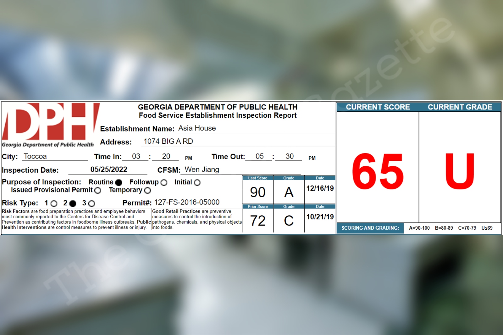 Asia House receives a 65% on their recent health inspection