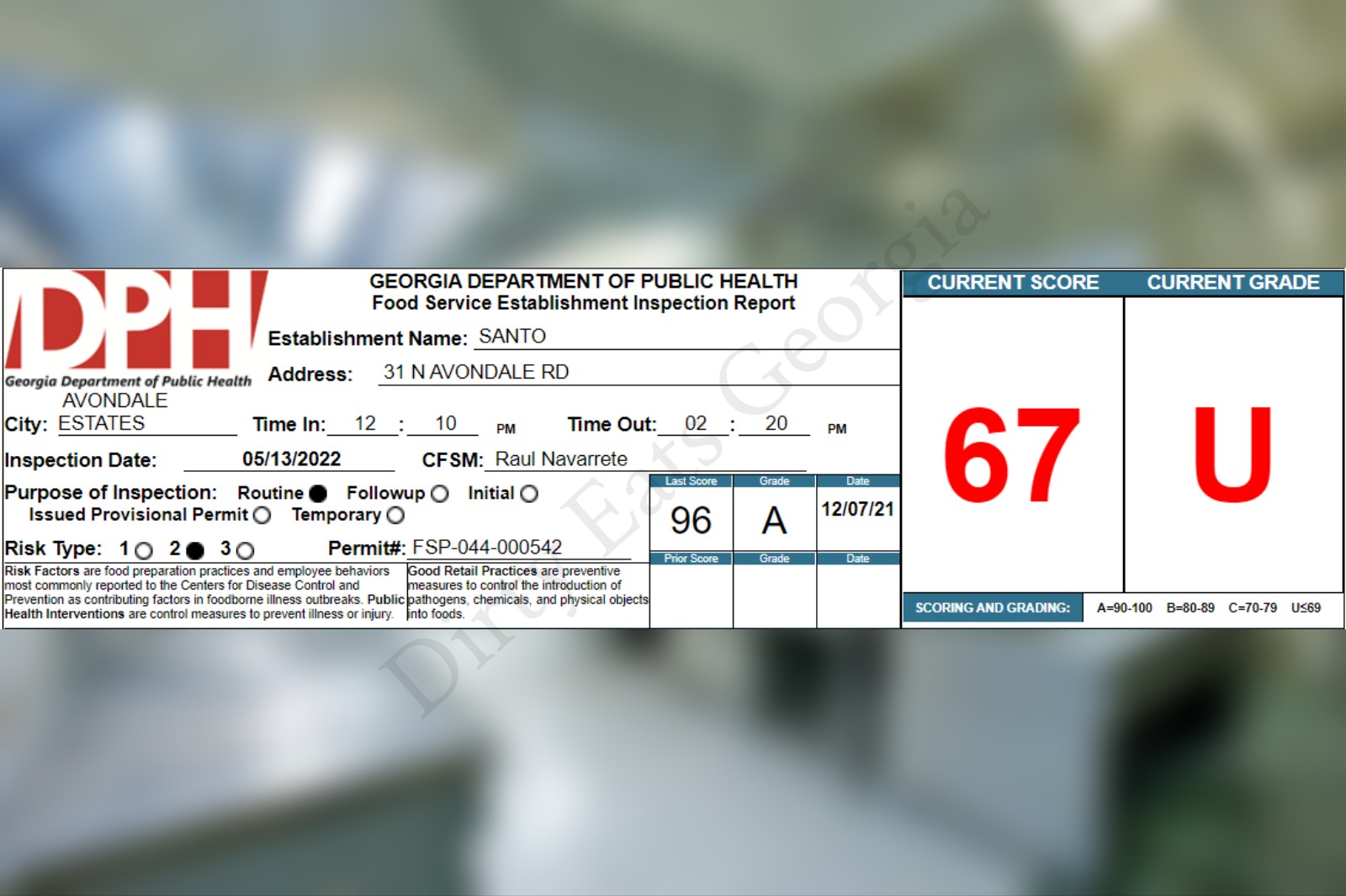 Santo receives a 67% on their recent health inspection