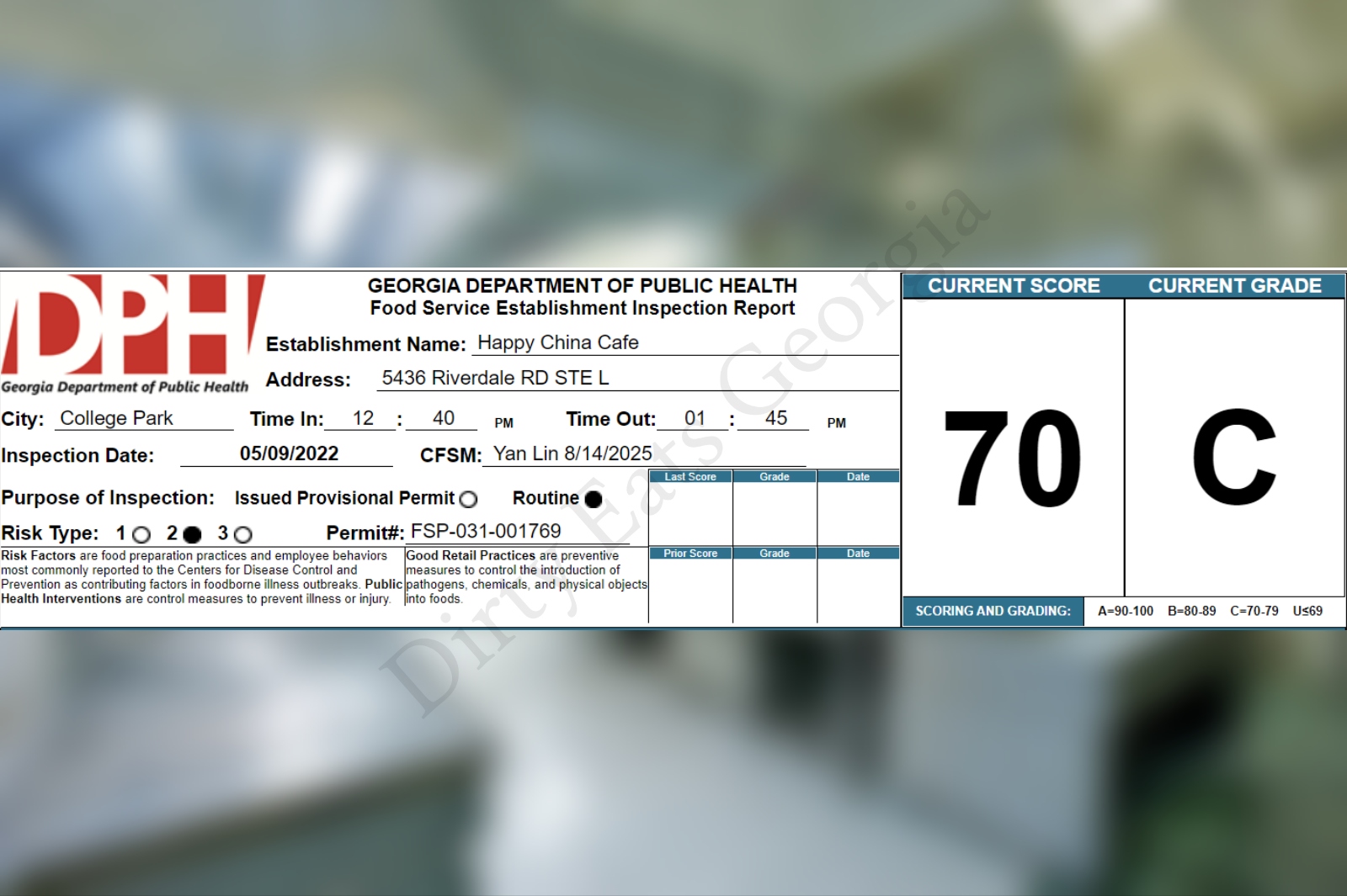 Happy China Cafe receives a 70% on their recent health inspection