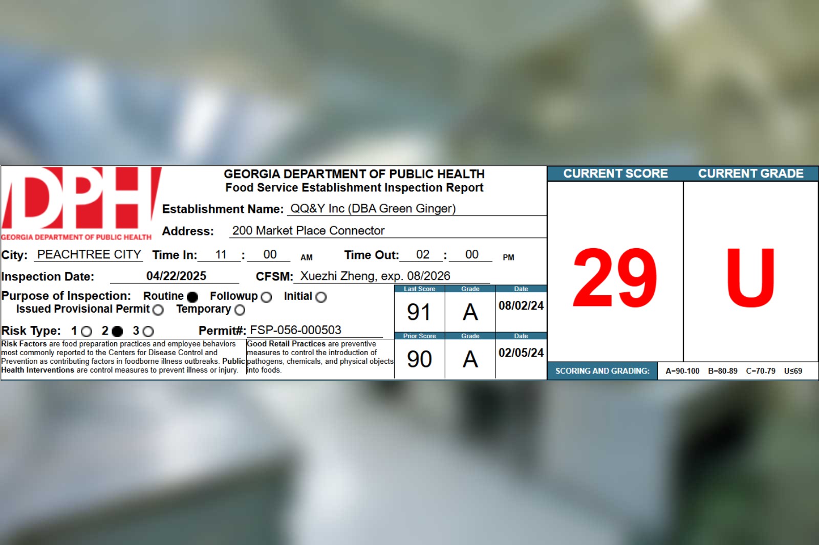 QQ&Y Inc (Dba Green Ginger), located at 200 Market Place Connector in Peachtree City, received a score of 29 points out of a possible 100 points during their 04/22/2025 inspection by the Georgia Department of Public Health.