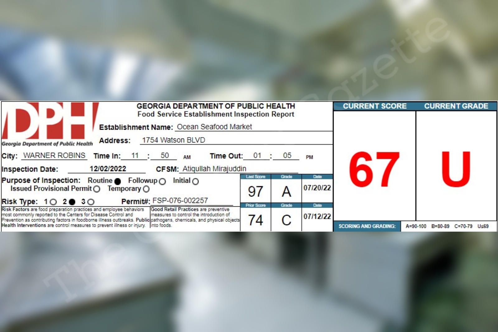Ocean Seafood Market in Warner Robins receives a 67% on their recent health inspection December 5, 2022