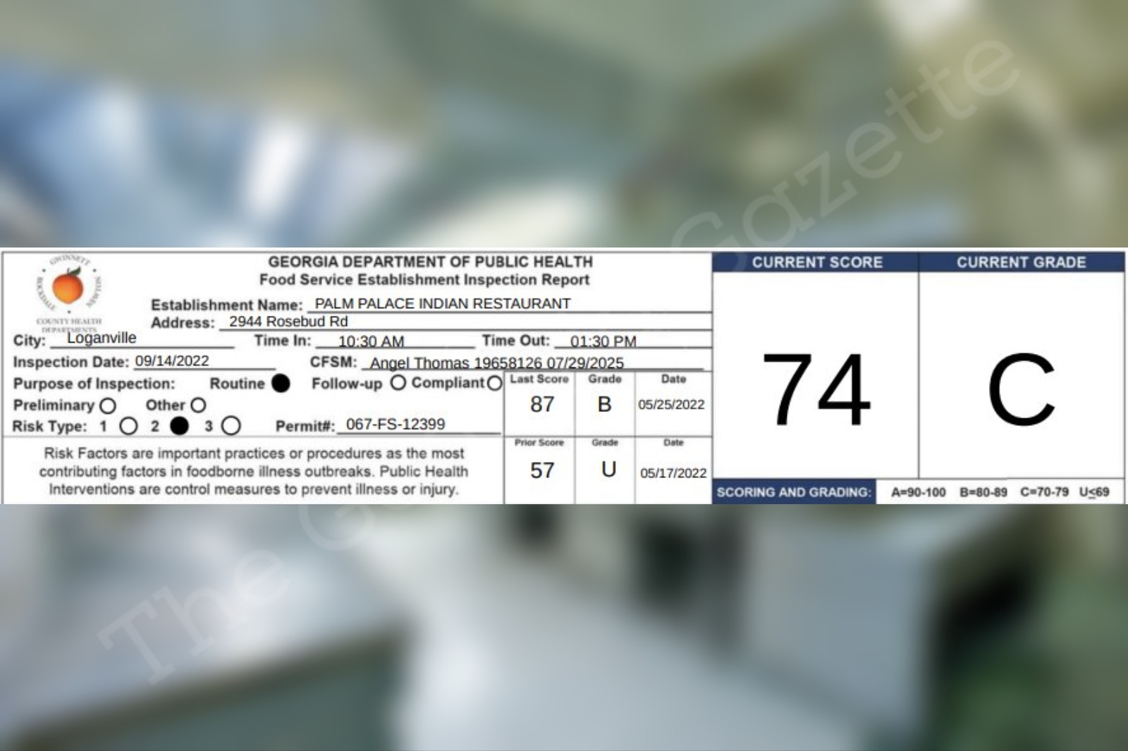 Palm Palace Indian Restaurant in Loganville receives a 74% on their recent health inspection September 15, 2022